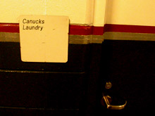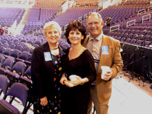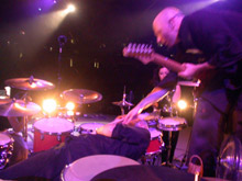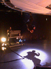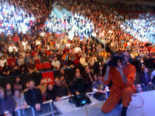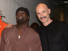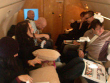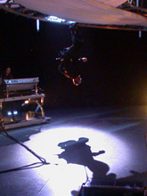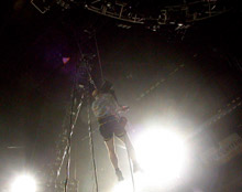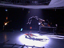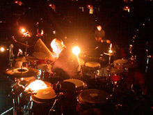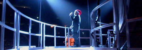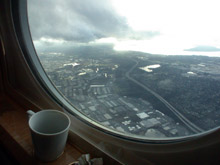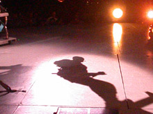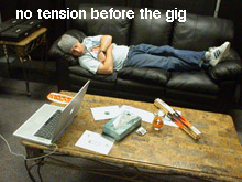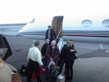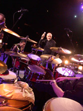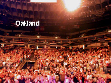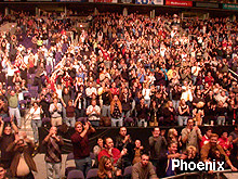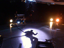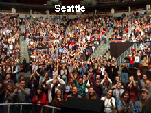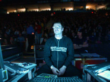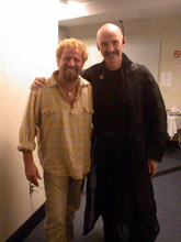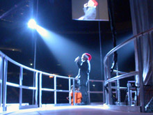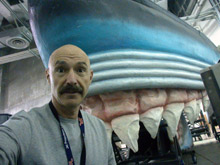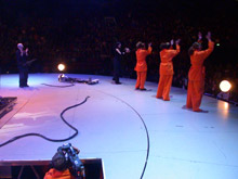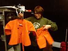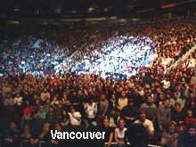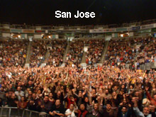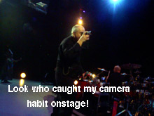 | ON TOURVancouver / Dec. 18 So many goodbyes today for us in the band and crew. First, our short afternoon flight from Seattle was on the chartered plane we've been using for much of the tour. The flight crew had become good friends, so it was a bit sad to be leaving them.     Though we weren't that well behaved - or was it some air turbulence that made so many of the towels go flying around the cabin? Odd how they all went toward management!     As we passed the air filled BC Place arena, we reminisced how Peter had performed there (on a bill with David Bowie) shortly after it was opened. This show was in GM Place - home of Vancouver's Canucks team.         Are they recruiting smaller orange crew members, or are the stage costumes shrinking??         Peter did Barry with a Santa hat - maybe somebody thew it up on stage. I also saw him with a camera in hand - perhaps couldn't resist after seeing me do it onstage so many times!     Gee, mixed feelings about the North American tour ending. We're all glad to head home for holidays, and see families, but it's been a wonderful tour, with great people thoughout the organization. There is hope, of course, that we'll pick up and do another leg of touring - possibly in the Spring. But no definite news on that yet. You can be sure it'll be up on the site when there is. Seattle / Dec. 17 Better weather, a day off, some time to visit friends in Seattle - topped off by another great audience for the show.      Me, with Trae Pierce, bassist with the Blind Boys. Some slightly un-authorized "orange people" appeared, dancing, during In Your Eyes. We expect these things on the last show of a tour leg, but were a bit surprised to see it a day ahead of time. Hmmm... wonder what tomorrow will bring.     San Jose / Dec. 15 In the depths of the backstage area here at the HP Pavillion at San Jose, I came across a pretty large shark head! My guess it's something to do with the local hockey team, the Sharks.     It's funny wandering inside these arenas - you're there for a rock show, but venue is pretty much there for the basketball and hockey teams that play there all the time - so you see spare equipment - baskets, goals, and such - lying around, and lots of locked off team workout and meeting rooms.    Lately I've been noticing how, when Peter and Mel walk upside down, sometimes their shadows are rightside up. Looks quite strange. More bad weather and high winds, as we head on for Seattle, and the last few shows of the U.S. tour. Oakland / Dec. 14 Ran into some nasty weather here in the Bay area. We flew in (right after the Phoenix show) in some high winds, but nothing compared to the wind and rain that hit San Francisco on Saturday.     Ran into an old friend, Sammy Hagar, just before going onstage.     Phoenix / Dec. 12     Hey, I'm like everyone else: can't resist those photos through the plane window!         More of the Olsen family showed up here in Phoenix - Bryan has broken the record for family members attending shows!   |